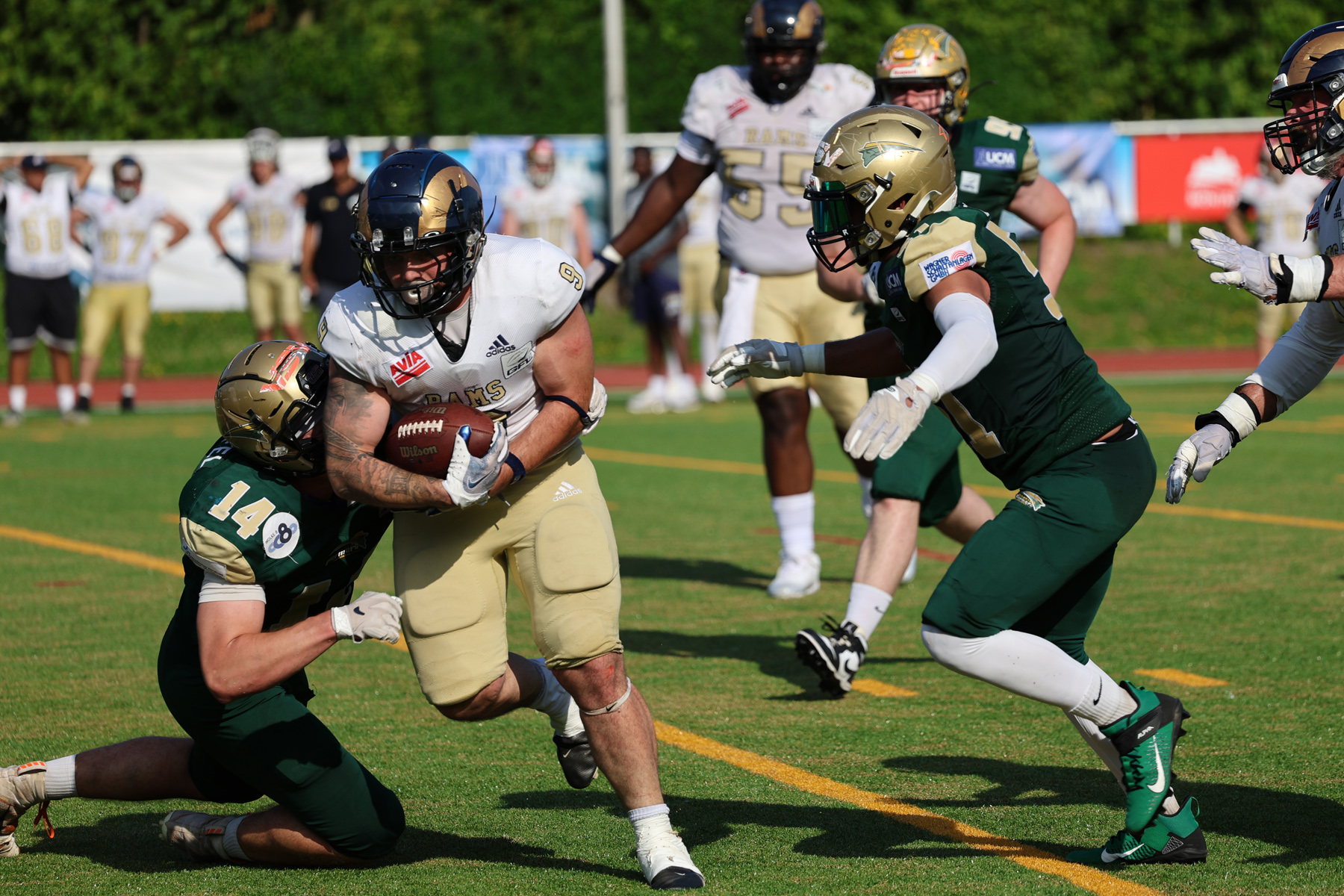 Und wieder eine spannende Zweitligapartie im Mons-Tabor-Stadion. Die Farmers legten gut los, mit zwei Rushing- Touchdowns ging man früh in Führung. Die Rams bewegten zwar den Ball gut, kamen aber nur zu Fieldgoals bzw. Versuchen, einer wurde von der Defense geblockt. Im zweiten Quarter übernahmen die Gäste das Kommando, konnten mit einem weiteren Fieldgoal und einem Touchdown plus Conversion ausgleichen. Kurz vor der Halbzeit hielt die Farmers-Defense dann und es ging mit 14-14 in die Pause.